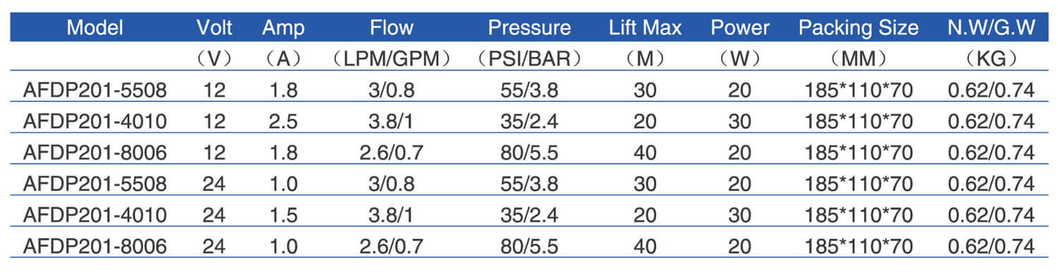 This series pump can be used for general water transfer, sprayer pumps, small rain system, or other industry usage (perfect for water heater shower, caravans, RV knapsack sprayer, wiper) , use it with fresh or salt water or other liquid with weak acid & alkaline is ok. This tape pumps will operate to 1.2 meters suction. The pump with built-in pressure switch, can be working automatically when the tap turn on-off, It’s intermittent duty tape.